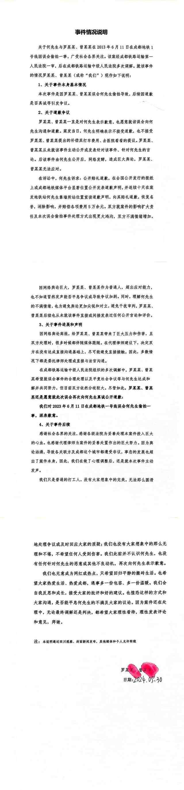 尽管如此,罗、曾二人还是愿意就此次误会再次向何先生真诚公开道歉:我们对2023年6月11日在成都地铁一号线误会何先生偷拍一事,深表歉意。
