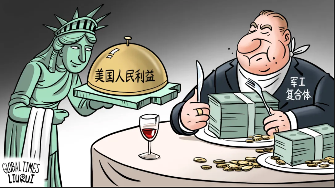 美国军工复合体已成为一个毒瘤,不仅危害世界,也严重侵蚀美国民众的利益。(漫画丨刘蕊)