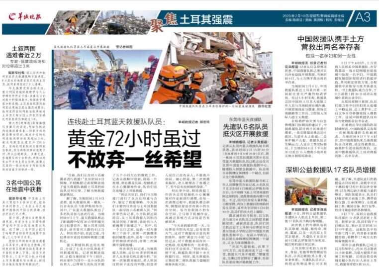 羊城晚报恪守新闻伦理,特别是对于灾难及事故报道,稳妥把握报道分寸,着重加强正面引导。2023年2月,土耳其、叙利亚发生强烈地震,羊城晚报特派全媒体记者挺入震中,多方核实了解中国公民受灾情况,一线直击中国力量对当地施展人道主义救援,鼓励当地民众早日战胜灾难、重建美好家园。2023年7月末,强降雨极端天气突袭京津冀地区,羊城晚报全媒体记者奔赴一线,全平台持续推出融媒报道,高度关注受灾民众生活状态、所思所困,广泛动员各方救助力量,积极帮助当地群众复工复产。