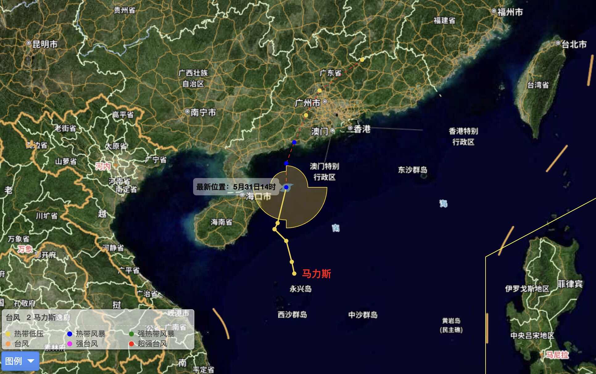 根据中央气象台5月31日14时25分发布的台风快讯,位于南海的热带低压已加强为今年第2号台风“马力斯”。根据监测,“马力斯”(热带风暴级) 5月31日14时中心位于北纬20.3度、东经111.9度,距离广东省阳江市偏南方向约175公里,中心附近最大风力达到8级(18米/秒,约65公里/小时)。