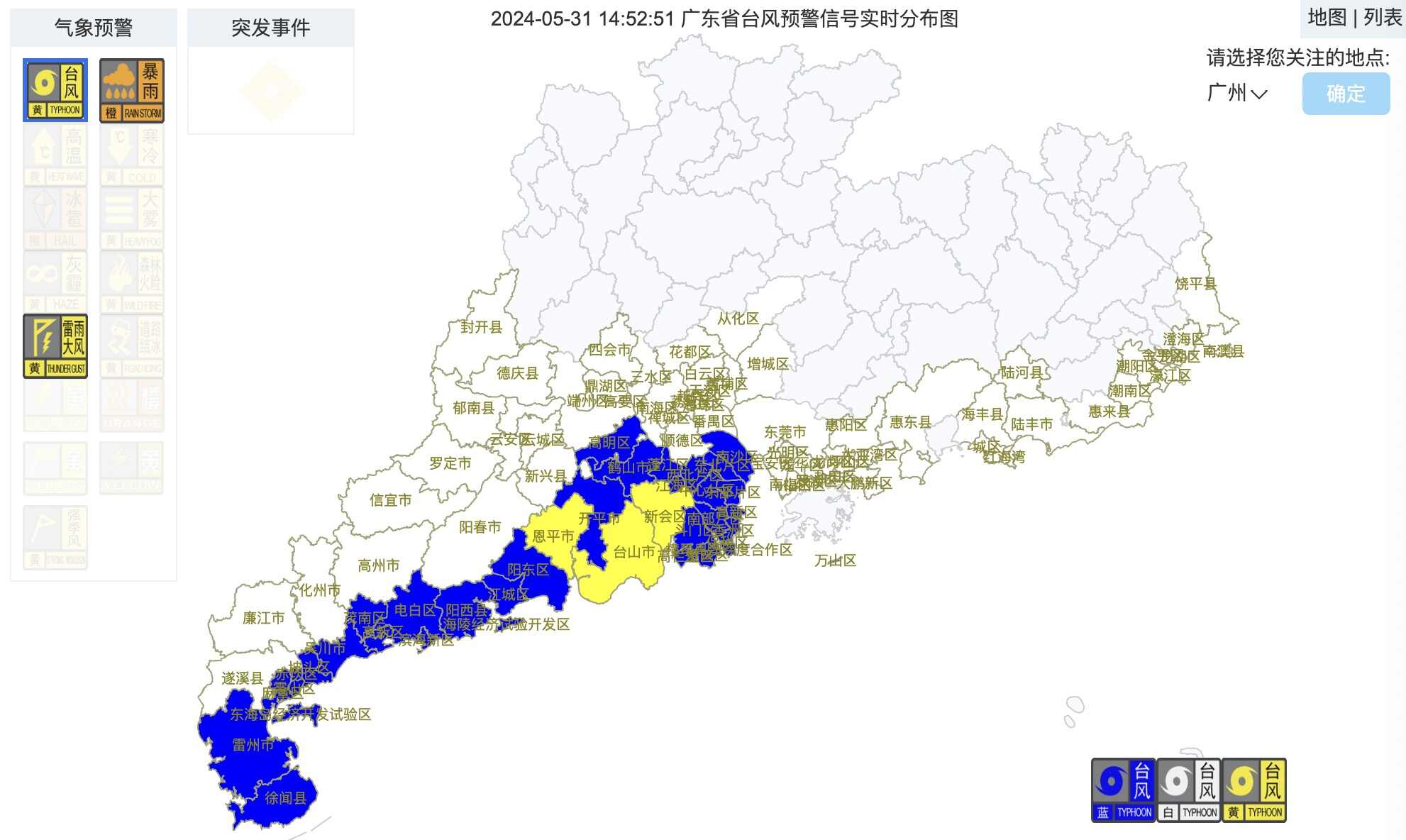 记者从广东省、广州市气象部门获悉,因今年第2号台风“马力斯”进一步移近及略有增强,广东多地继续提升预警等级。截至31日14时52分,东起饶平、西至徐闻的广东沿海地区均已发布台风白色或以上预警信号。