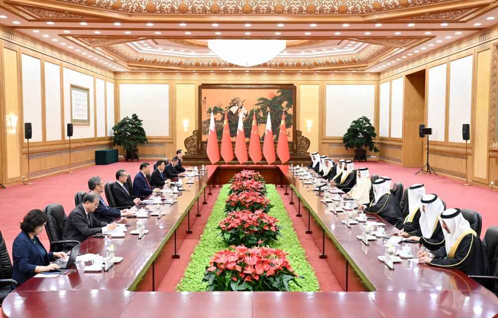 会谈前,习近平在人民大会堂东门外广场为哈马德举行欢迎仪式。