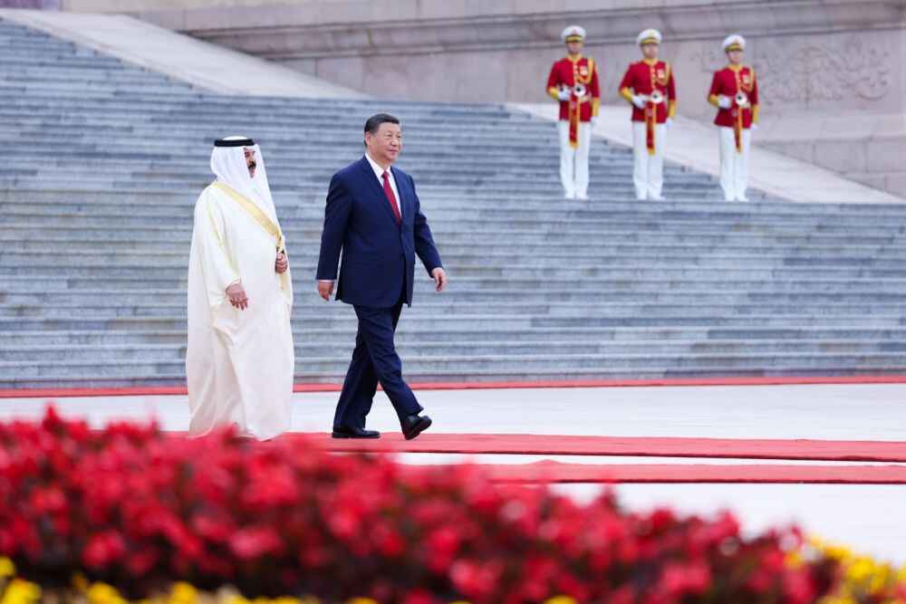 5月31日下午,国家主席习近平在北京人民大会堂同来华国事访问并出席中阿合作论坛第十届部长级会议开幕式的巴林国王哈马德举行会谈。这是会谈前,习近平在人民大会堂东门外广场为哈马德举行欢迎仪式。新华社记者 姚大伟 摄