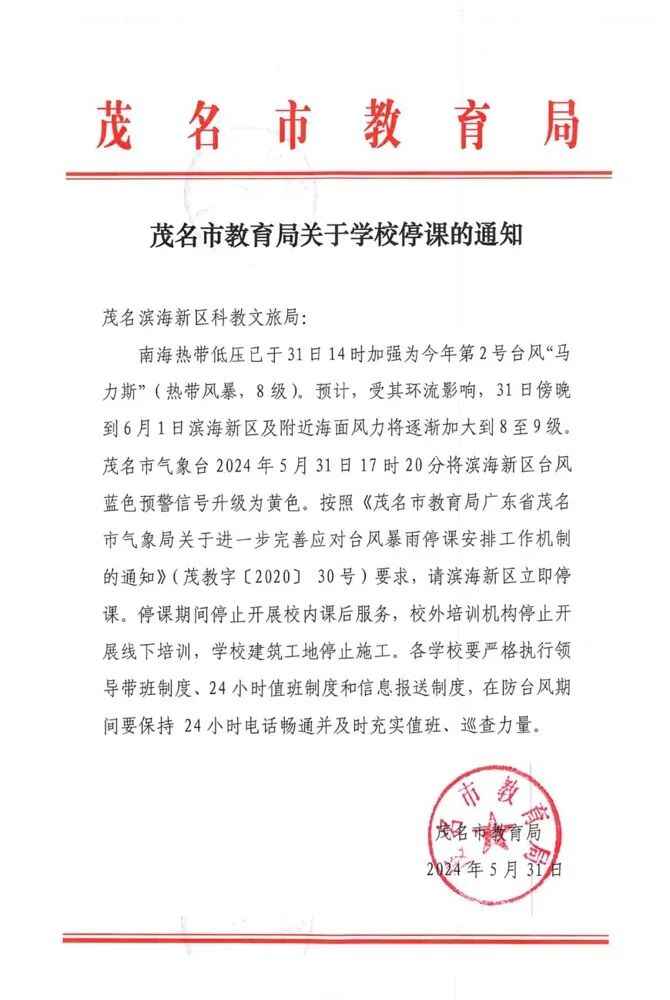 5月31日晚20时,茂名市教育局发布关于学校停课的通知:滨海新区立即停课,停课期间停止开展校内课后服务,校外培训机构停止开展线下培训,学校建筑工地停止施工。