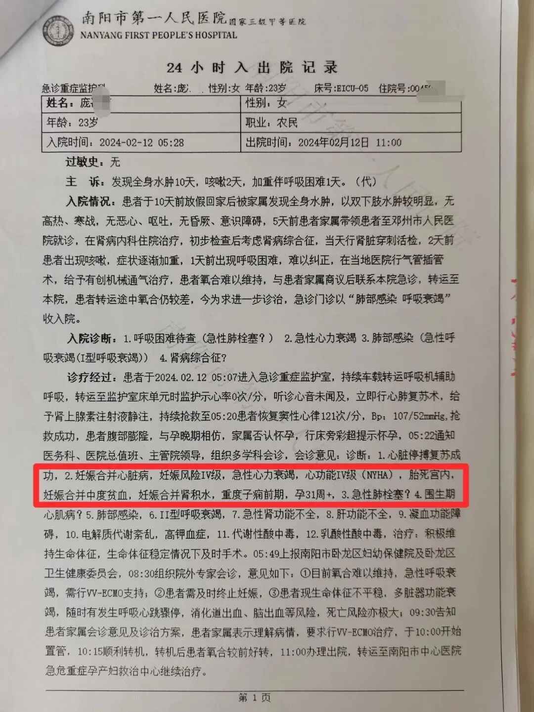 2月12日上午,丽丽被转运到南阳市中心医院急危重症孕产妇救治中心,诊断结果和南阳市第一人民医院一致,立即安排进行剖宫取胎手术。手术后,丽丽一直昏迷,直到2月20日死亡。