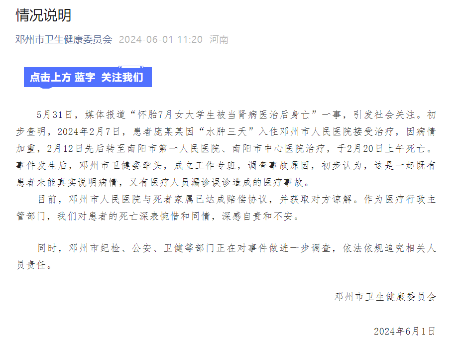5月31日,媒体报道“怀胎7月女大学生被当肾病医治后身亡”一事,引发社会关注。初步查明,2024年2月7日,患者庞某某因“水肿三天”入住邓州市人民医院接受治疗,因病情加重,2月12日先后转至南阳市第一人民医院、南阳市中心医院治疗,于2月20日上午死亡。事件发生后,邓州市卫健委牵头,成立工作专班,调查事故原因,初步认为,这是一起既有患者未能真实说明病情,又有医疗人员漏诊误诊造成的医疗事故。