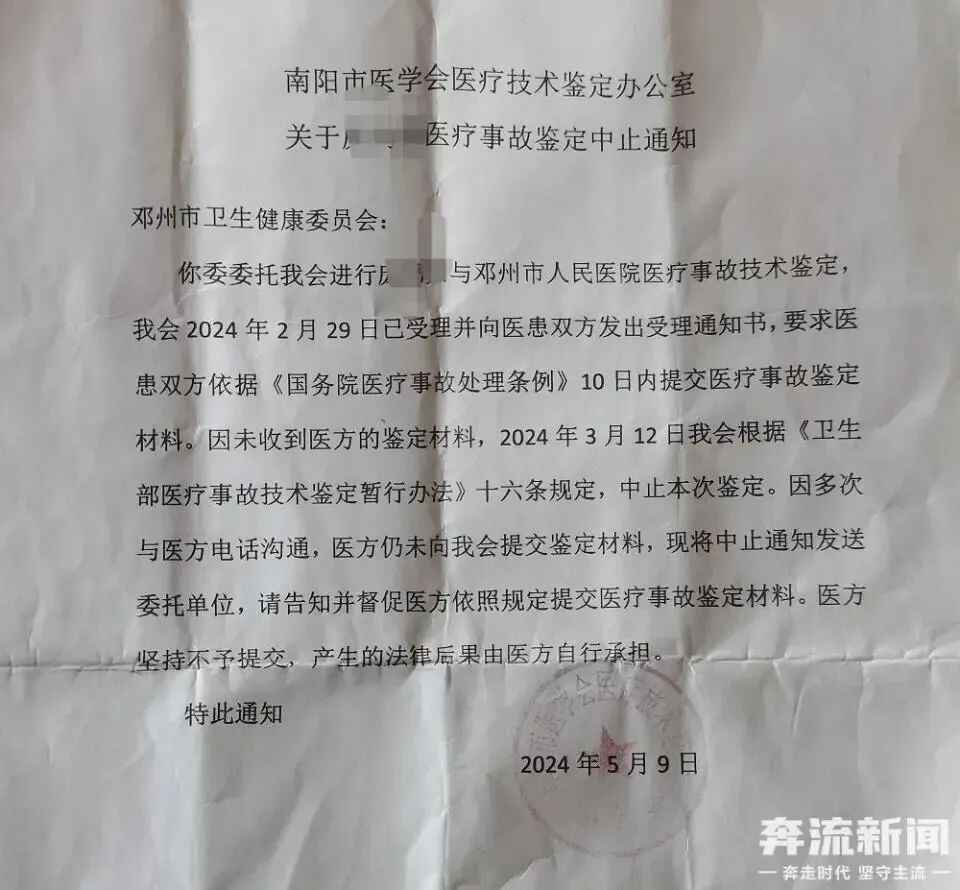 在庞先生的申请下,邓州市卫健委委托南阳市医学会进行医疗事故鉴定。但近日,庞先生收到了一份医疗事故鉴定中止通知。