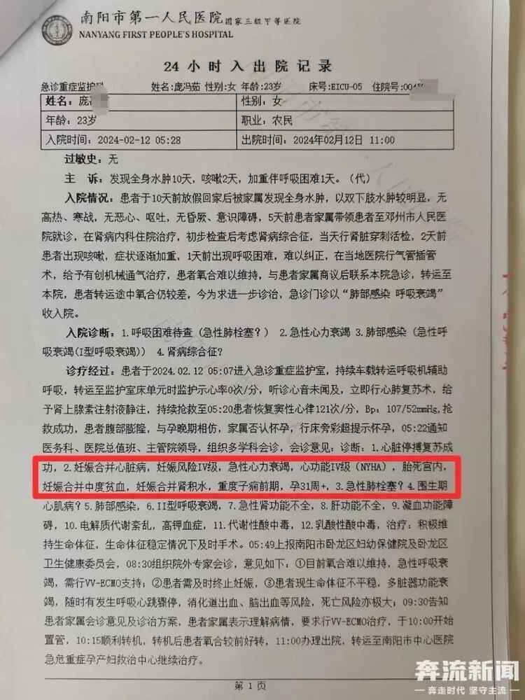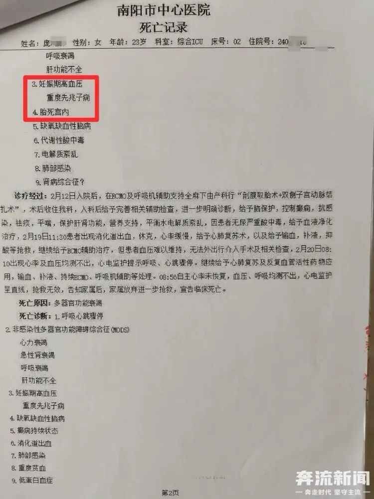 2月12日上午,丽丽被转至南阳市中心医院急危重症孕产妇救治中心,诊断结果和南阳市第一人民医院一致,医生立即安排进行剖宫取胎手术。术后,丽丽一直处于昏迷状态,持续至2月20日死亡。