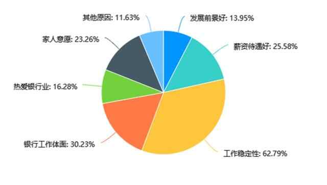 根据经济观察报发起的“关于毕业生去银行网点工作的意愿调查”的结果,在179位受访的应届毕业生中,有112位毕业生有意愿在银行网点工作,其中超过70%的人被银行的福利待遇和稳定性所吸引。绝大部分受访者将该工作的稳定性视为选择的首要因素。可谓虽说宇宙的尽头是考公务员,但考不上公务员还有银行“兜底”。