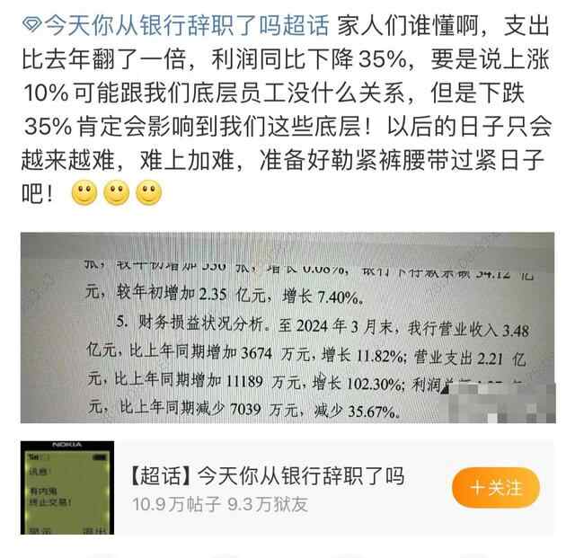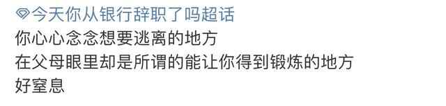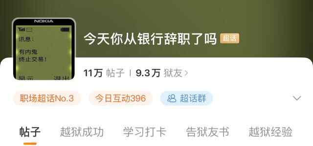 早在2018年7月,新浪微博上就出现了一个名为“今天你从银行辞职了吗”的超话。截至目前,该超话已有9.3万位网友参与,发帖11万条,获得了约10.2亿的阅读量。在这个圈子里,银行人在超话中吐槽自己的经历:高强度的工作节奏和长时间的工作、考核指标的压力、降薪和调岗的无奈……有人戏称自己为“狱友”,有人分享自己的“越狱”经验。与此同时,还有很多年轻人在这里为应聘银行而打卡备考。“围城”内外的两批人,相遇在同一片网络天地。