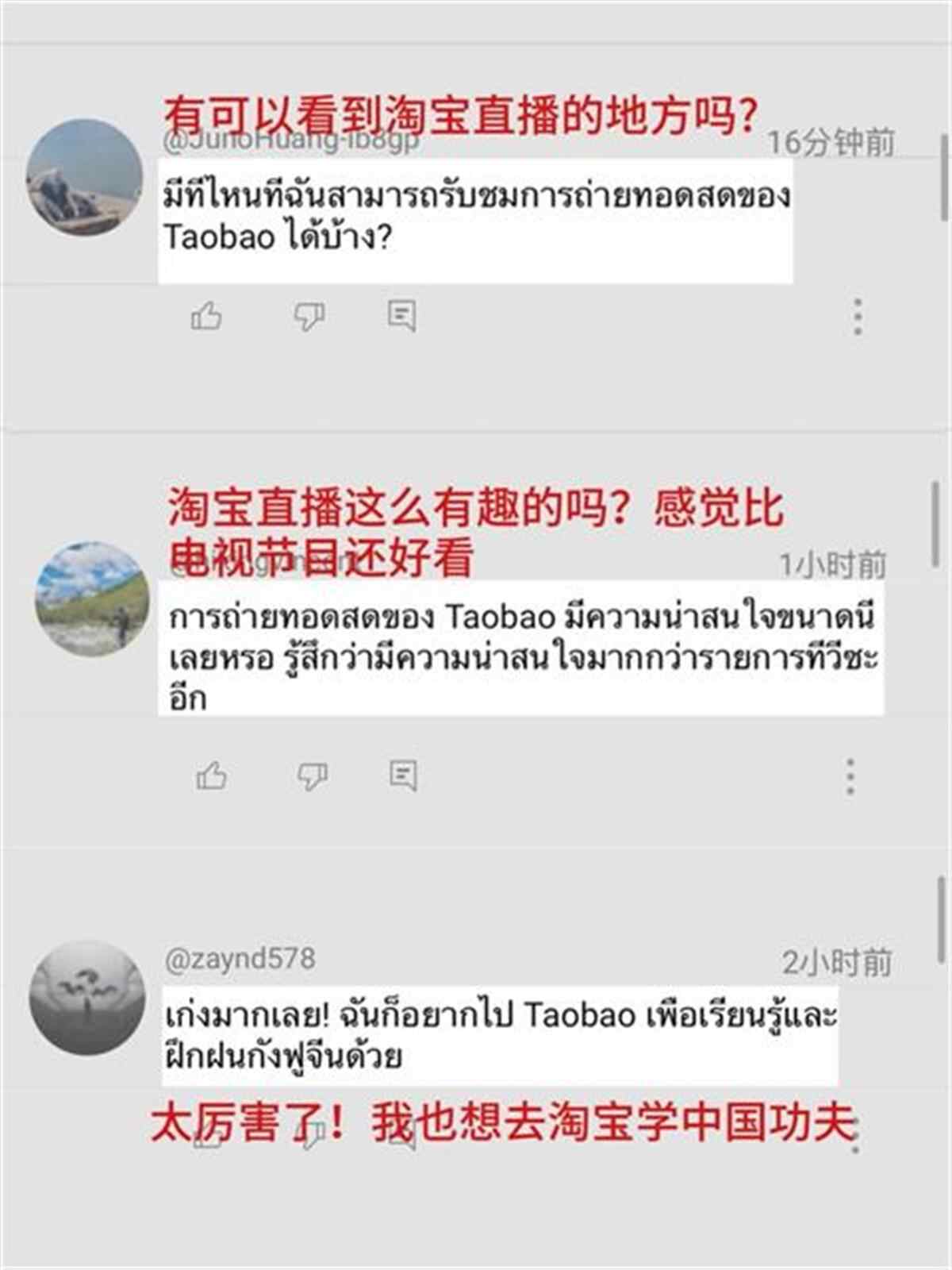大量泰国网友在视频底下留言:“这么有趣吗?感觉比电视节目好看”“太厉害了,我也想和这些主播学功夫”“谁能告诉我,哪里能看到淘宝的直播”。