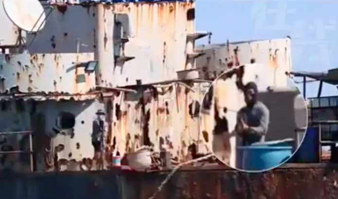 ◆菲律宾非法“坐滩”仁爱礁军舰人员接受空投补给时枪指中国海警。详情-->