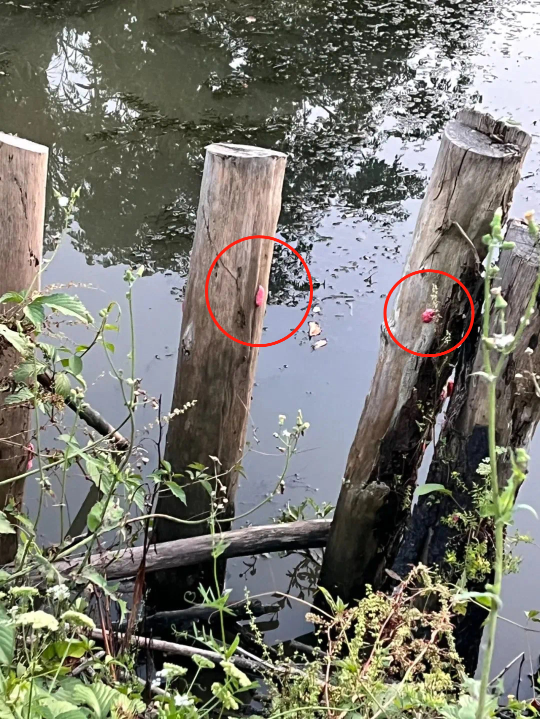 这些奇特的“花”,由一粒粒小圆球组成,看上去像是粉红色桑葚,遍布在河道内侧和木桩上。