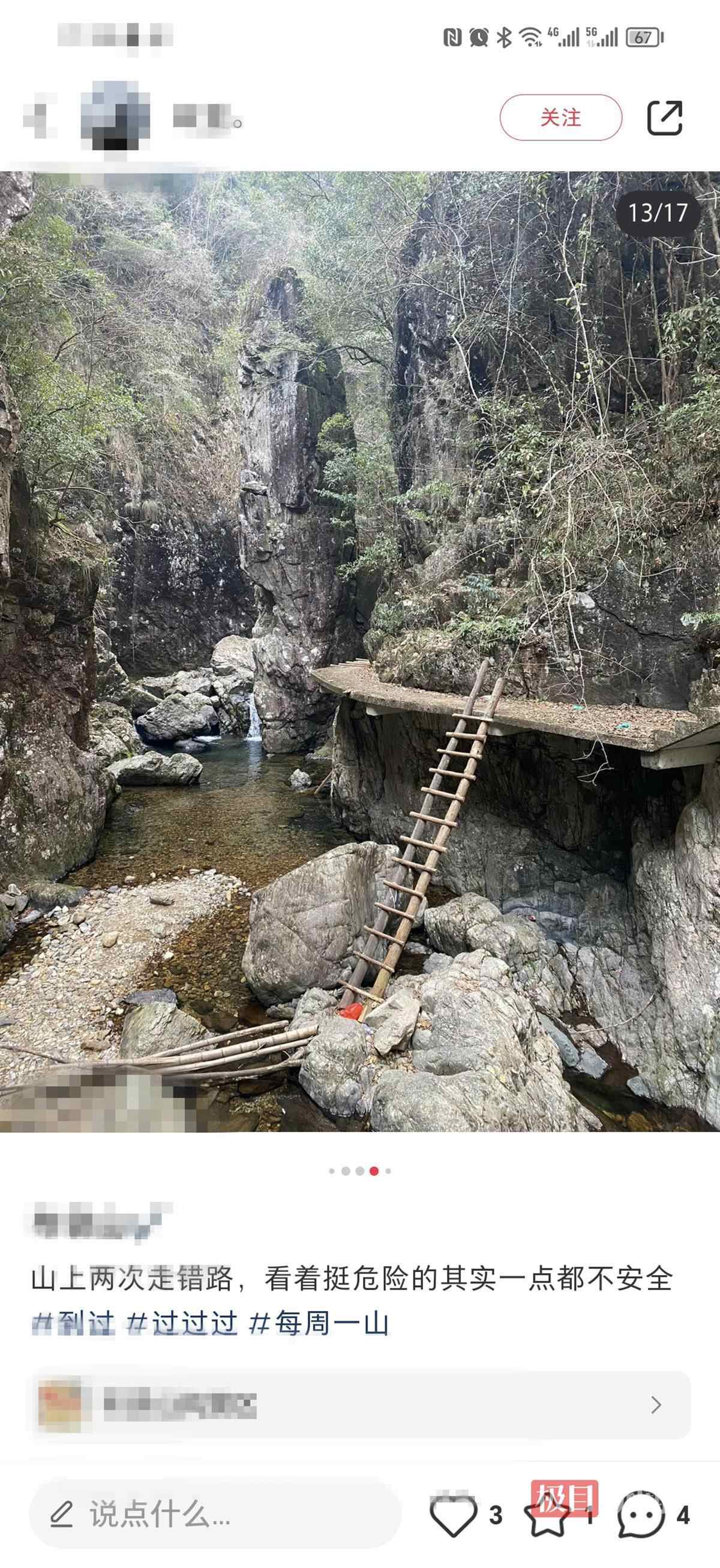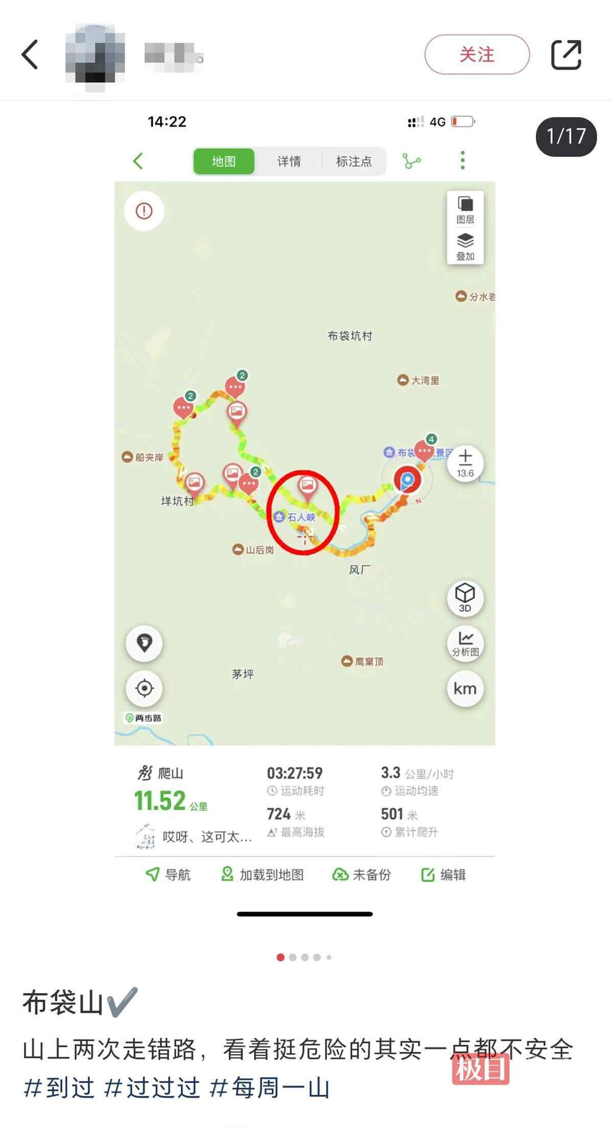 石人峡紧邻台州布袋山景区。3日下午,布袋山景区工作人员向记者介绍,事发地点不在布袋山景区内,但很多驴友发布的徒步路线会经过布袋山和石人峡。记者在小红书上检索“台州布袋山徒步”发现,有网友贴出的徒步路线图确实包含石人峡。