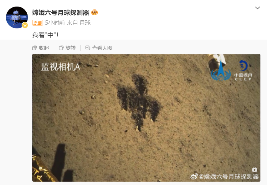 今天,嫦娥六号上升器携带月球样品自月球背面起飞。采样之后,月背呈现一个“中”字,嫦娥六号月球探测器发了一条微博:我看“中”!此前,嫦娥六号发回了着陆月球背面拍摄的系列影像图,包括落月过程中降落相机拍摄的着陆区域附近影像、全景相机拍摄的着陆点影像。