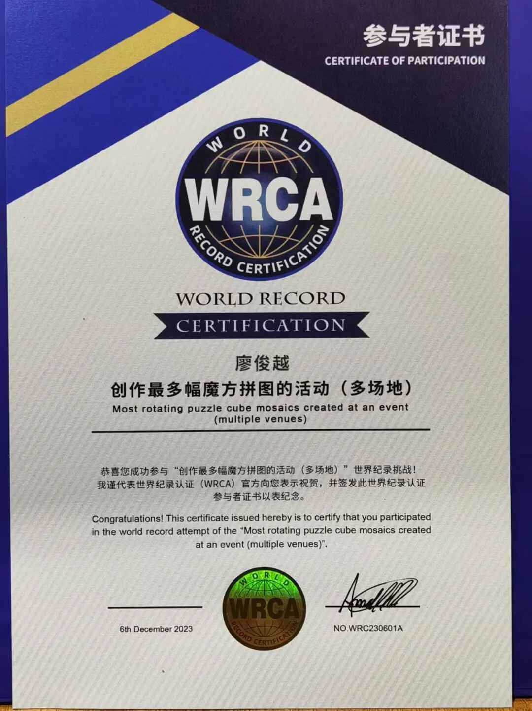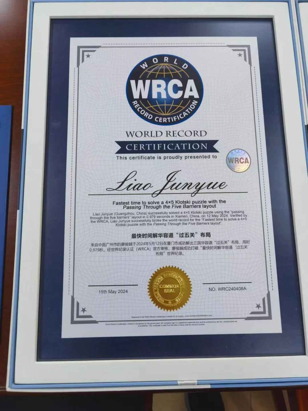 拿到认证后,廖俊越高兴地说:“对于把世界纪录保持在中国,我感到十分自豪。接下来,将继续保持自己的学业,冲刺理想的大学;同时,努力在华容道比赛中成为一位优秀的导师,希望教出更多世界纪录保持者,让更多世界纪录留在中国。”