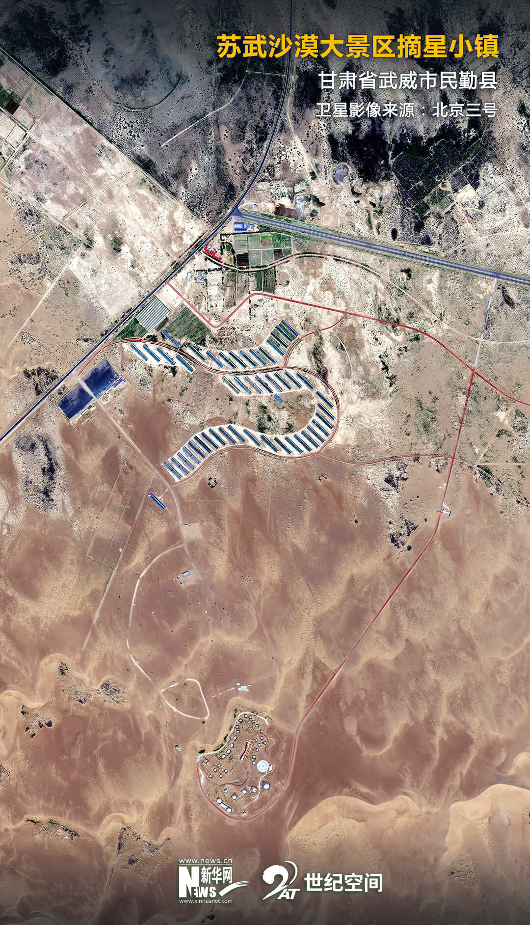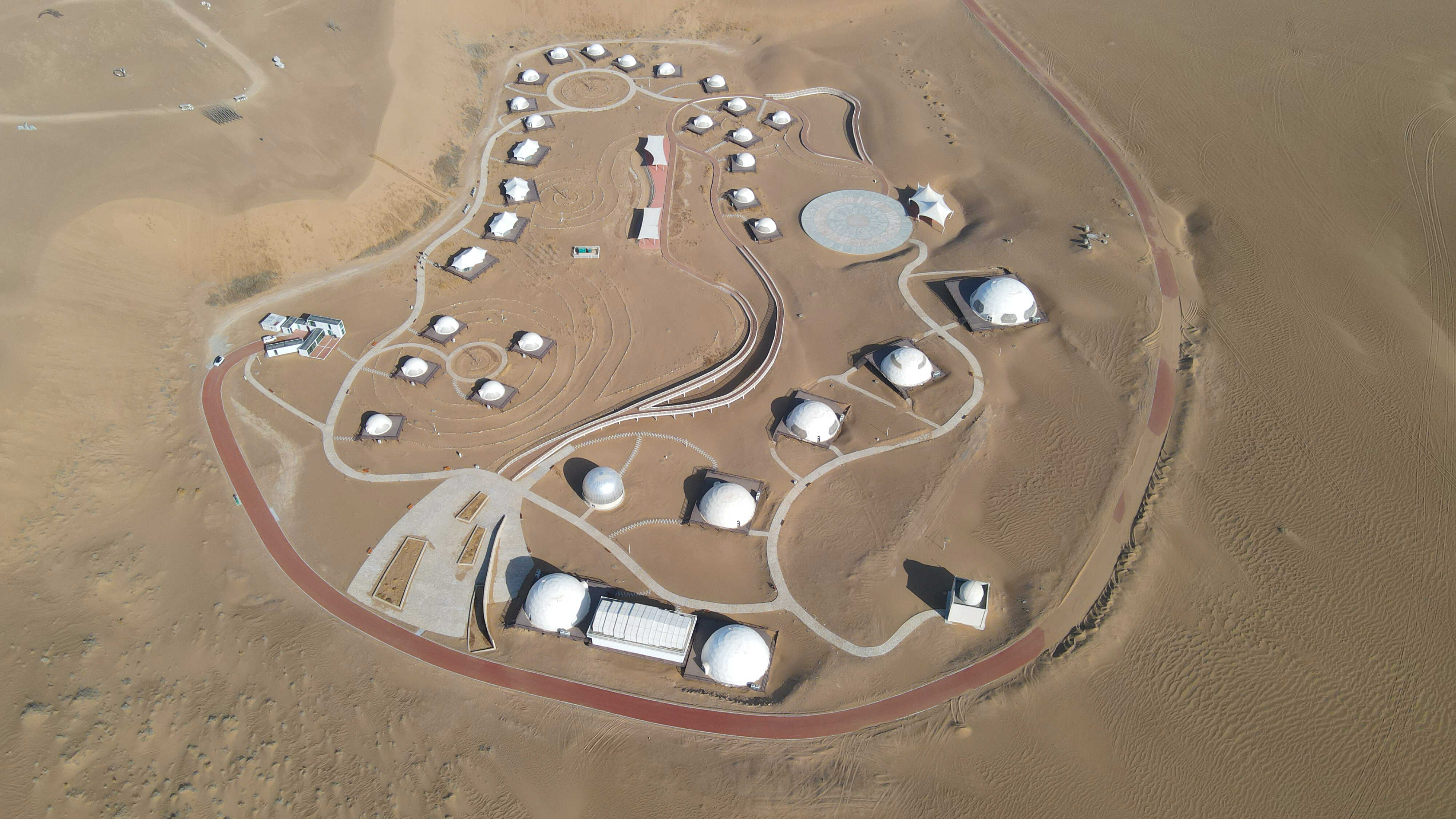 从一望无际的光伏蓝海,到星罗棋布白色星球建筑,一条与沙共处的生态保护和经济效益双赢之路正在大漠上徐徐展开。