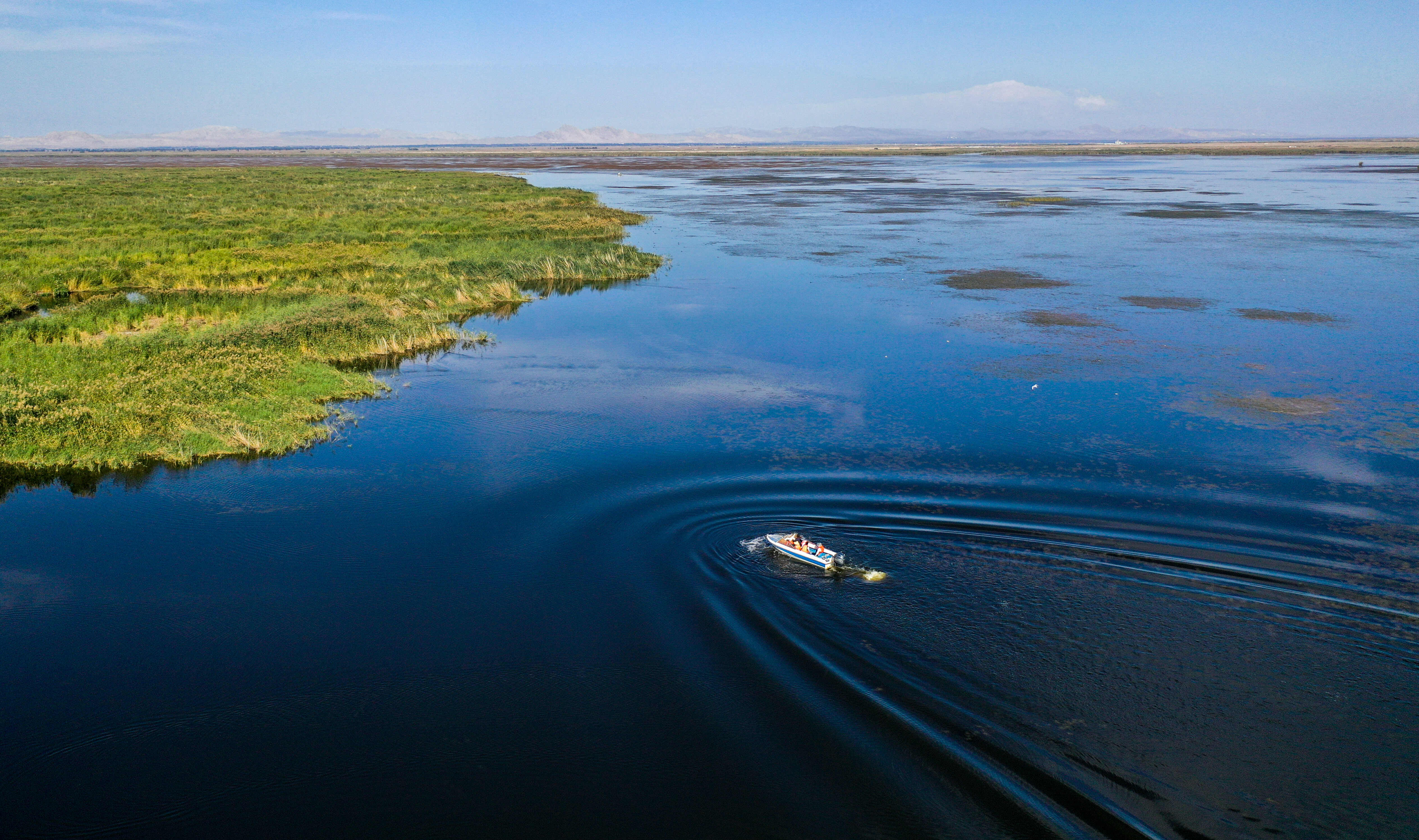 内蒙古乌梁素海湖面上,河湖湿地水环境保护与修复技术研究团队成员乘坐快艇去采集湖水样本(2023年9月15日摄,无人机照片)。新华社记者 连振 摄