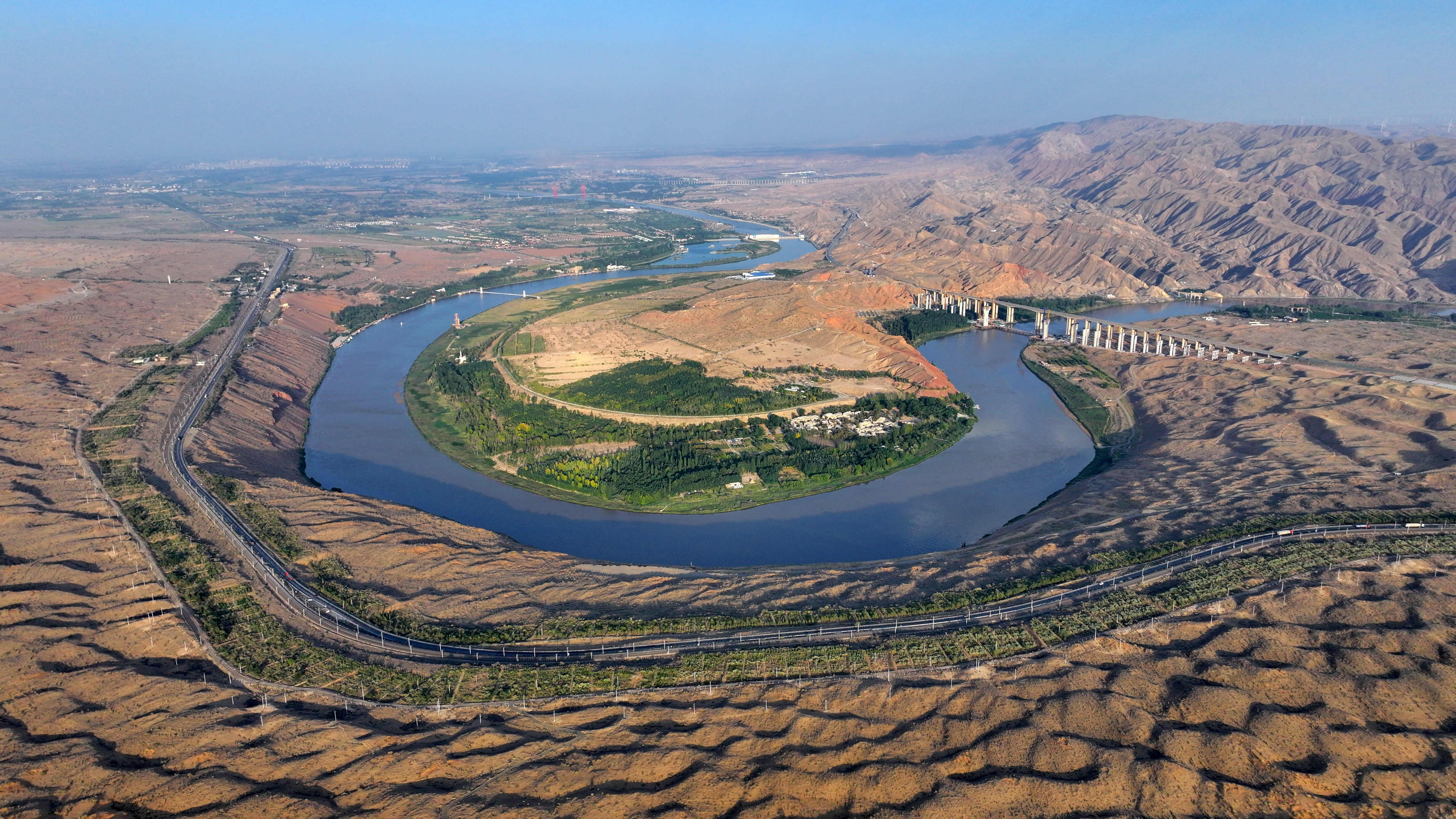 这是流经宁夏中卫市沙坡头区的黄河(2023年9月6日摄,无人机照片)。新华社记者 王鹏 摄