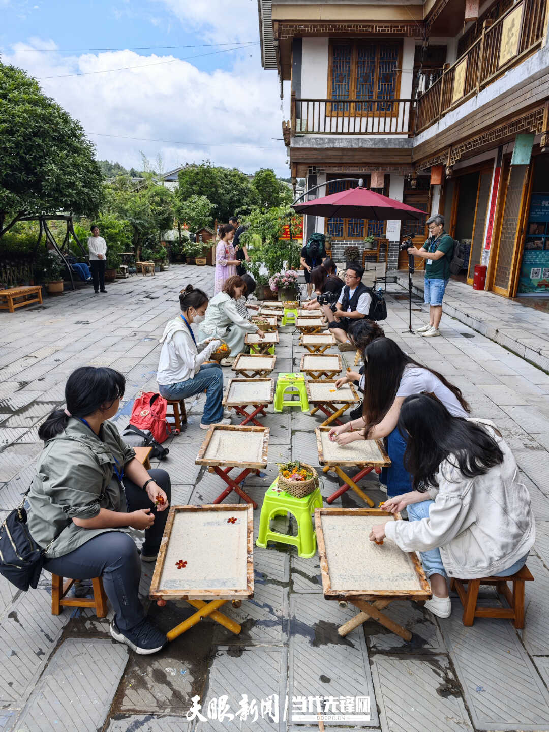 来到贵州的首站,台湾青年们来到花茂村,在这里首次体验了古法造纸纸浆压花画技艺。大家跟随当地老师的动作,加入各自创意,将一朵朵色彩斑斓的花瓣,细致地摆放在半湿的纸浆上,花瓣间错落有致,造型多彩各异。