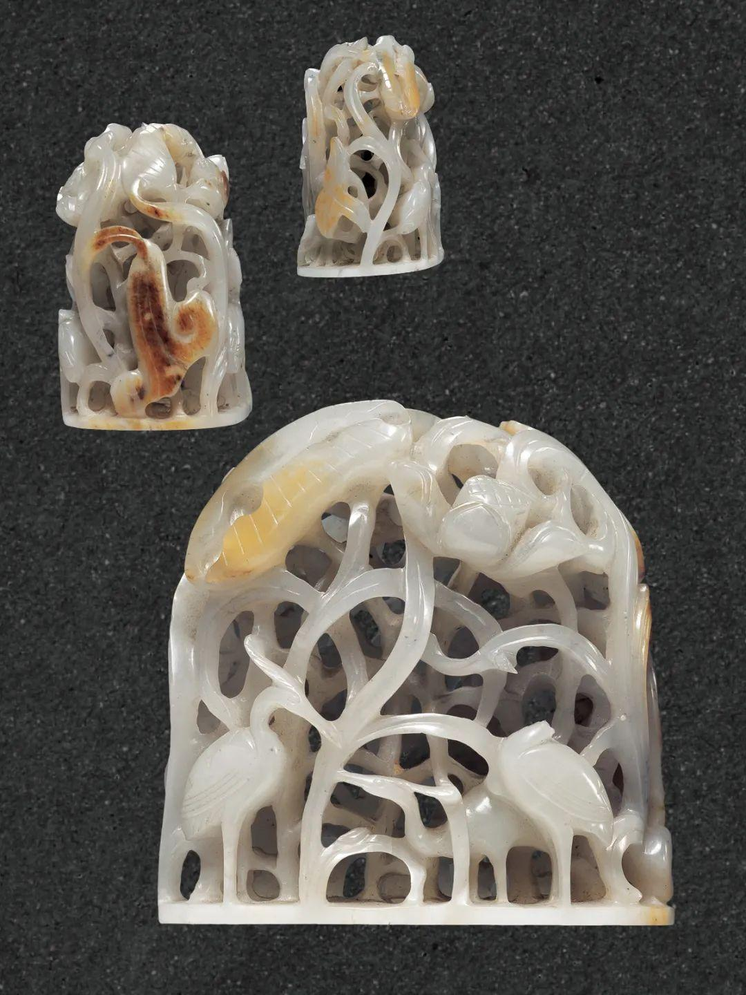 此件上雕数只鹭鸶在莲叶间穿梭。鹭鸶和莲花,取鹭与路、莲与连的谐音,有“一路连科”的美好寓意。