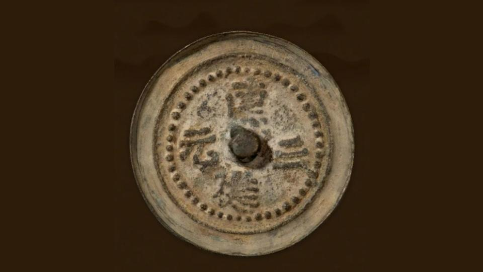 此镜中环钮铭文为“连进三元”,寓意读书人参加科举考试得中状元的美好愿望。