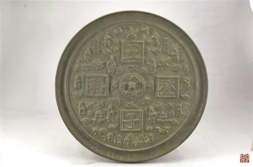 这面“五子登科”多宝纹大铜镜,不仅在直径上比明清时期日常使用的铜镜大上一圈,图案的雕刻也显得更为精细。镜主题饰有方格纹的楷书“五子登科”四字,字的四周布满各式人物与如意吉祥纹。