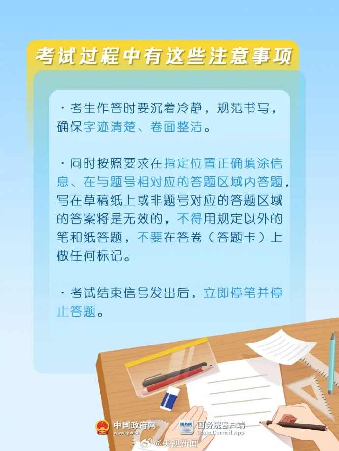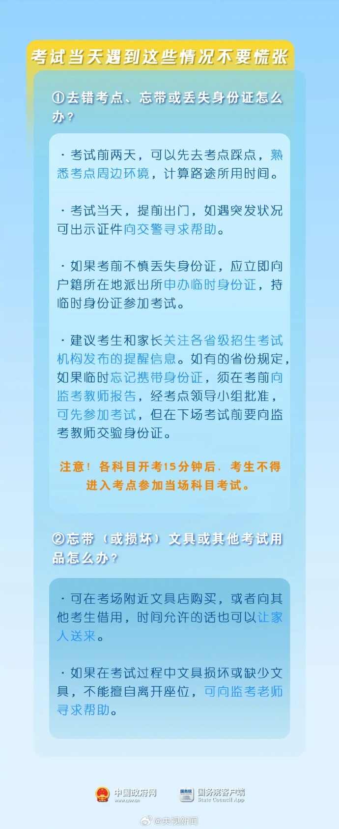此外,考生要注意,如遇突发极端天气并发布相应延迟上学、停课级别的预警信号,不涉及停考。
