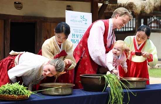 6月5日,韩国首尔,端午节临近,外国留学生正在体验菖蒲水洗头。在天气炎热的端午,自古以来就有用菖蒲水洗头消除邪气,保持健康头发的风俗。