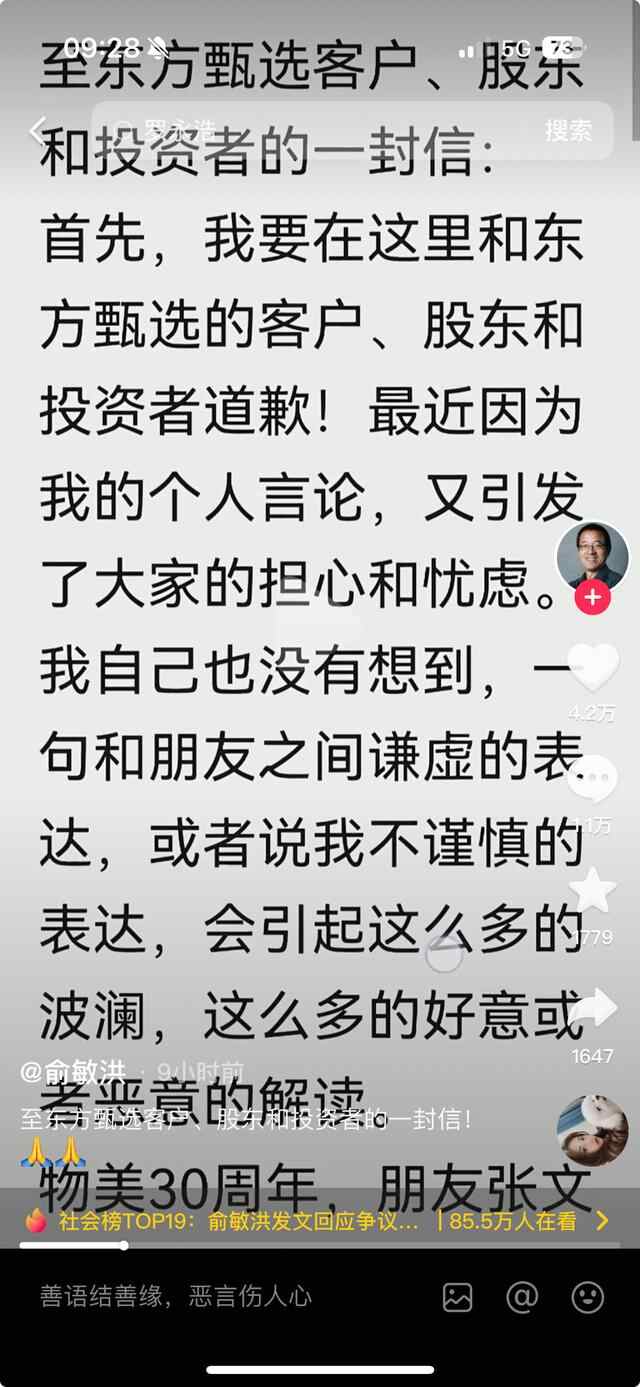 评价东方甄选直播“做得乱七八糟”引发股价大跌?俞敏洪致歉。