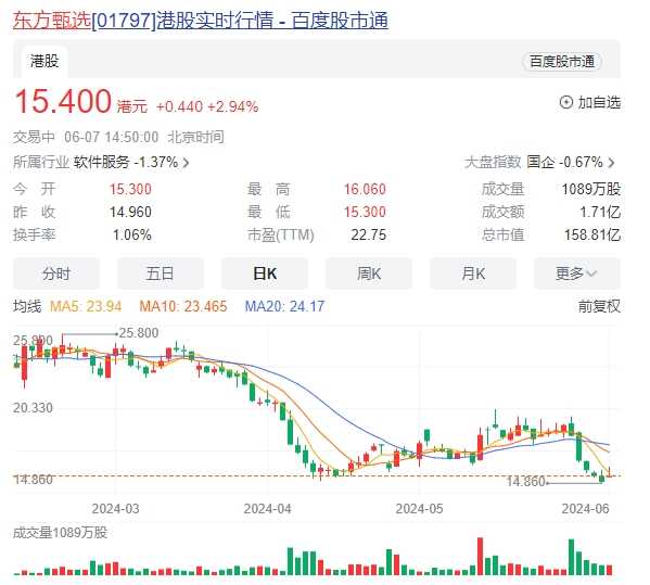 在俞敏洪致歉后,6月7日,东方甄选股价开盘后上涨,盘中一度涨近7%。