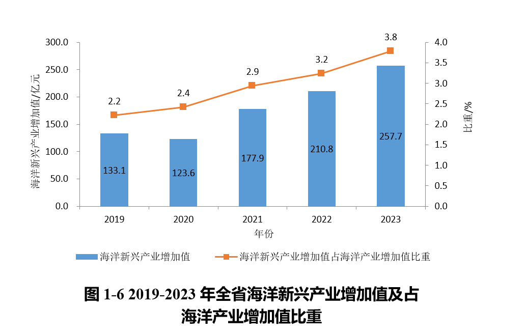 与此同时,广东的海洋工程装备制造、海洋药物和生物制品、海洋电力、海水淡化等海洋新兴产业发展迅猛,2023年产业增加值为257.7亿元,同比名义增长22.2%,占海洋产业增加值比重提高到3.8%。其中,海洋工程装备制造业增加值为115.3亿元,同比名义增长48.0%。