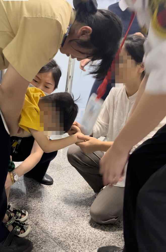 此时一名身着蓝色衣服的热心女乘客刚好经过,见状迅速上前,表明自己是医护人员,判断小男孩的情况是呼吸不畅导致,需立即实施海姆立克急救法,随即抱起男孩不断挤压腹部。