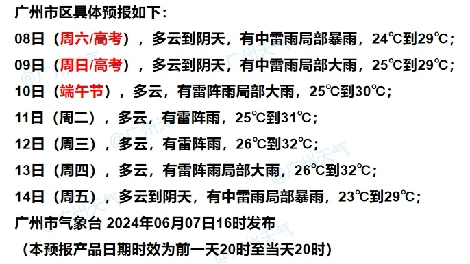 广州8日雷雨活跃,有中雷雨局部大雨或暴雨,降水集中时段为早晨、午后至下午(较强),可能与下午赴考、返程有重叠。8日重点关注白云、荔湾、海珠、越秀、天河、黄埔、番禺等中南部区域。