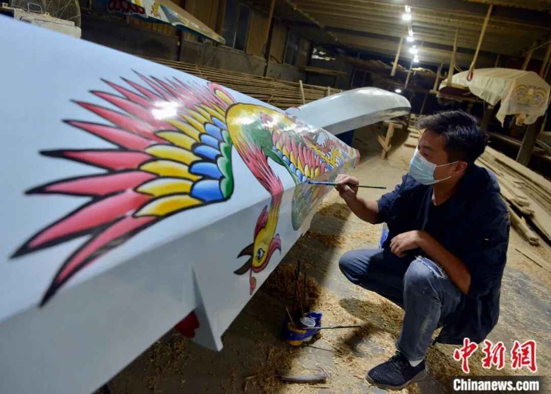 “龙舟世家”方忠雄龙舟厂画花师傅在对龙舟“化妆”。一条龙舟基本是船头和船身画莲花、寿桃、鲤鱼等,寓意吉祥如意。在船尾,则是画龙、凤、鹰等灵禽猛兽,寓意霸气威武。中新社记者 张斌 摄