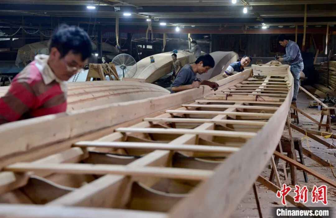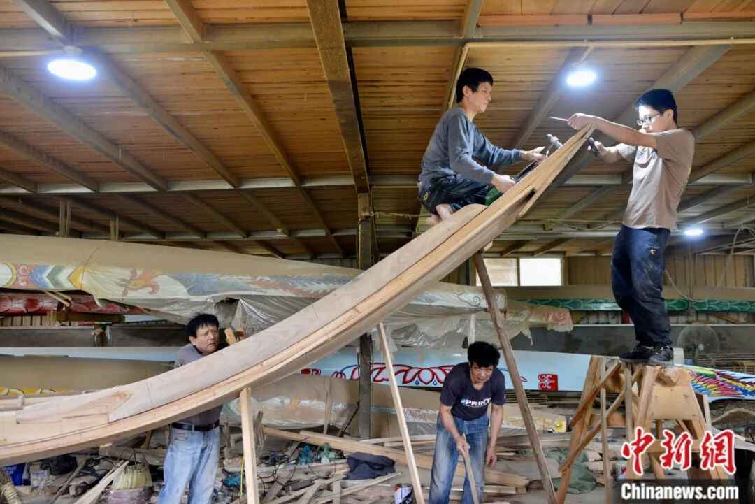 龙舟厂内,造船师傅们各显神功,刀起锤落,在木花四溅中,传承着龙舟传统手工制作技艺。中新社记者 张斌 摄
