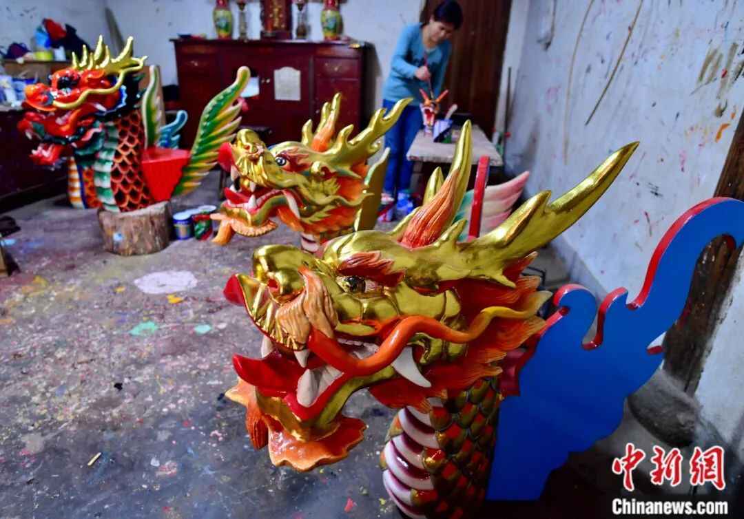 在方庄村的一家龙头制造厂内,正在制作中的各式龙头。龙头代表着自己所属村落的信仰和图腾,因此在龙头样式的选择上,每个客户都不尽相同。中新社记者 张斌 摄