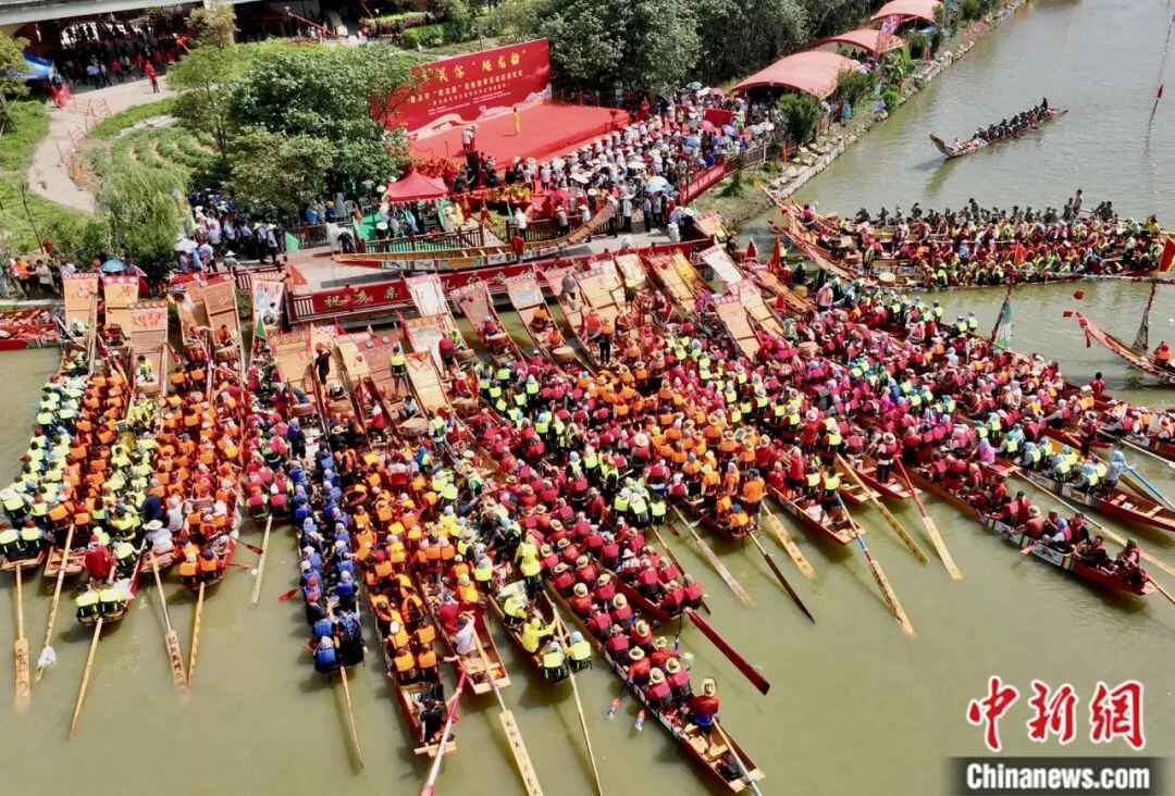 图为2023年百艘龙舟齐聚黄石华江参与竞渡盛会。中新社记者 王东明 摄