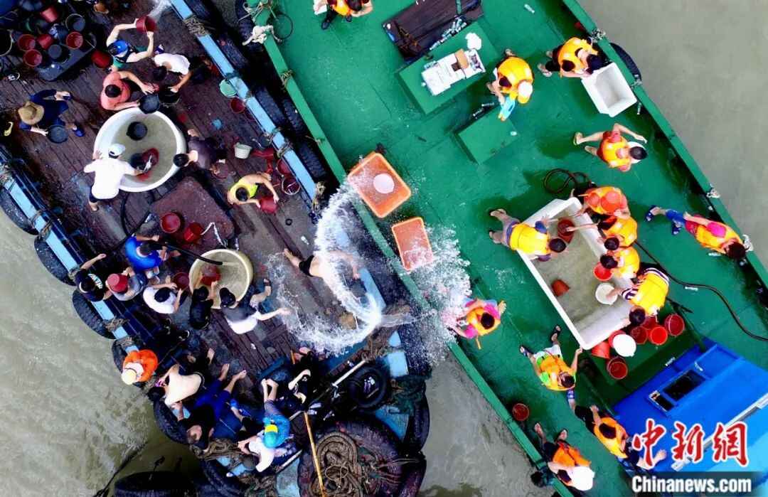 每年农历的五月初五端午节,数万民众聚集福建石狮蚶江海上泼水闹端午,“海上捉鸭”等民俗活动也同时上演。中新社记者 柯宁 摄