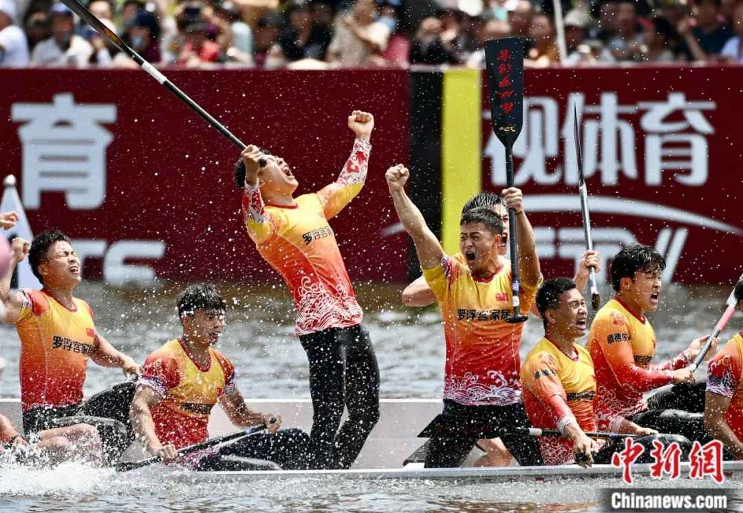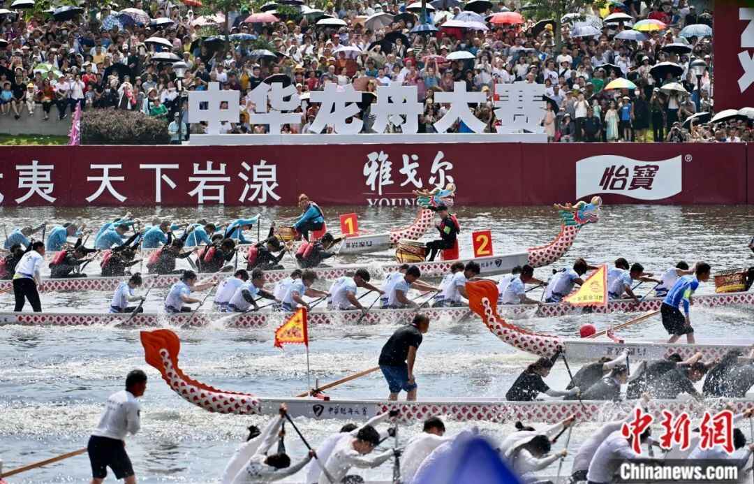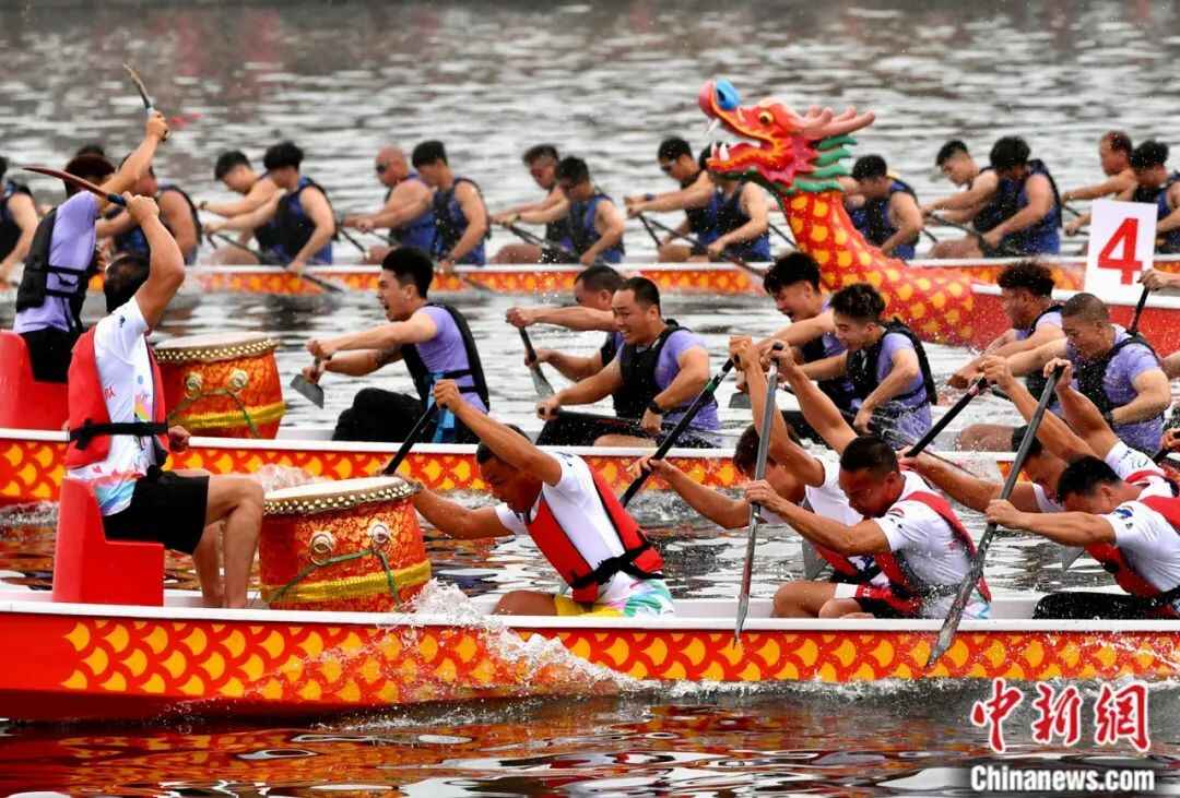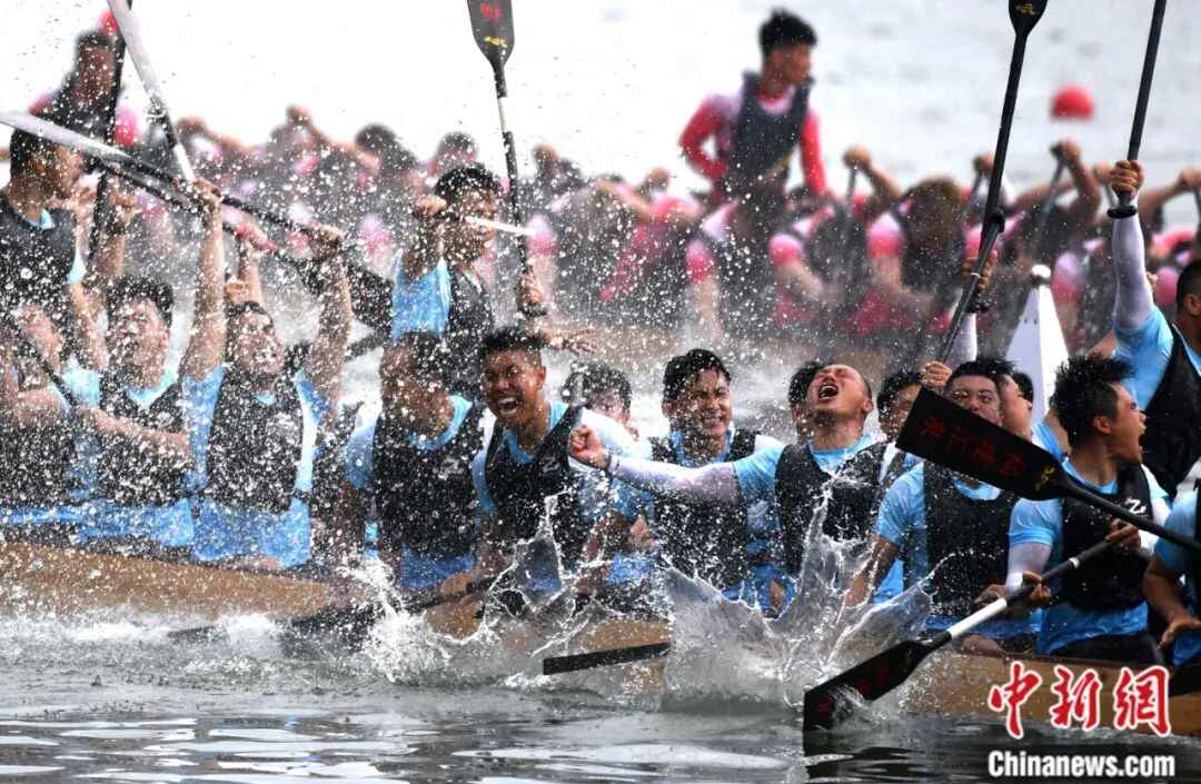 伴随着铿锵有力的鼓声,龙舟劈波斩浪,上演速度与激情。中新社记者 张斌 摄