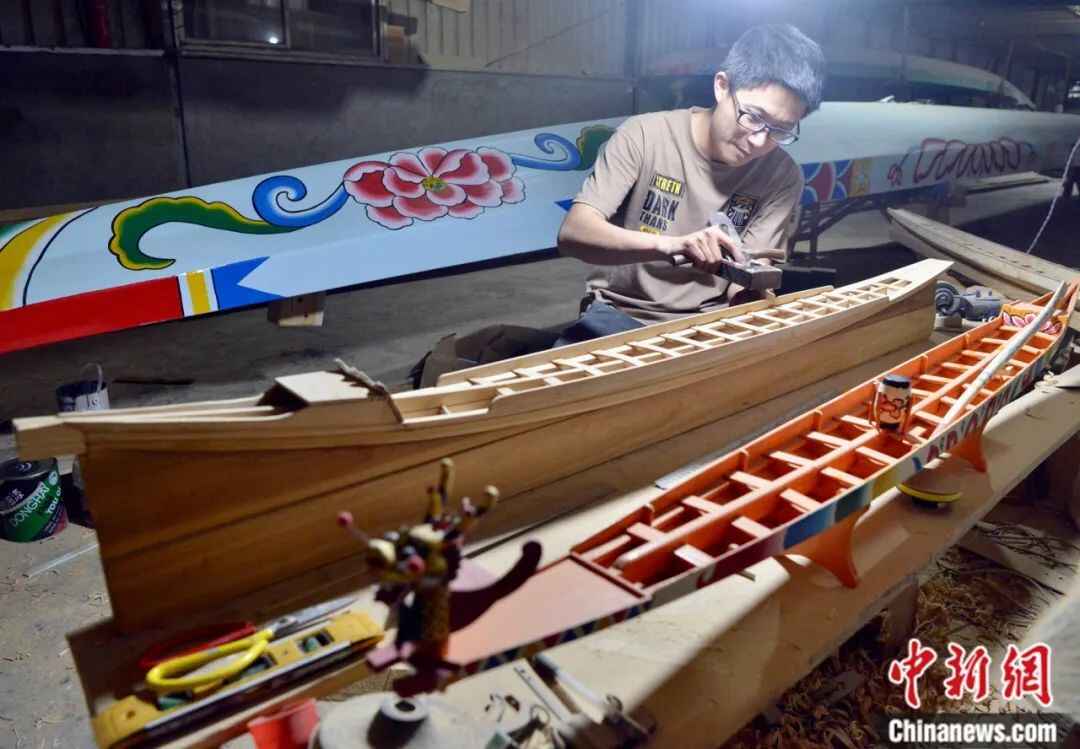 夜里,方庄龙舟制造技艺第四代传人方剑伟正在制作“龙龙仔”。作为新一代龙舟技艺传承人,近几年他尝试将龙舟做成模型进行推广。造型多样的“龙龙仔”应运而生,收获不少龙舟爱好者的喜爱。中新社记者 张斌 摄