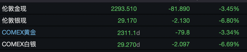 当地时间6月7日(周五),黄金价格遭遇重挫。伦敦金现、伦敦银现分别收跌3.45%、6.8%。其中,现货黄金价格一度跌破2290美元关口。COMEX黄金期货主力合约收跌3.34%,创2022年4月22日以来主力合约最大收盘跌幅,报2311.1美元/盎司,刷新5月8日以来收盘低位。COMEX白银期货主力合约收跌6.69%,报29.27美元/盎司。