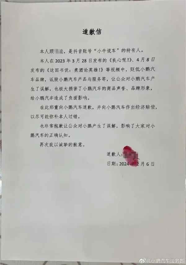 2024年2月,抖音博主“小牛说车”已经向小鹏汽车发布道歉信。道歉信提到,该账号2023年3月28日、4月8日发布的视频中贬低小鹏汽车品牌,并诋毁小鹏汽车产品与服务等,在此郑重向小鹏汽车道歉,并向小鹏汽车作出经济赔偿。