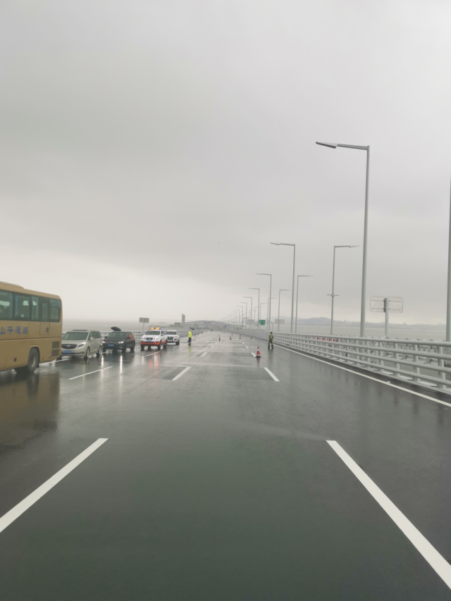 目前,大桥上可变情报板、路牌、路灯、护栏、地面标识已全部完成。