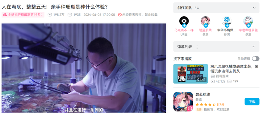 这个环节在今年有了新变化,《碧蓝航线》拿出的宣传纪录片仍是一线纪实,但选择形式更符合年轻人的观看习惯了——和UP主(亿点点不一样)合作,拍摄UP主走进南海,亲自做珊瑚保护工作的过程,包括专家分享也是交流形式。