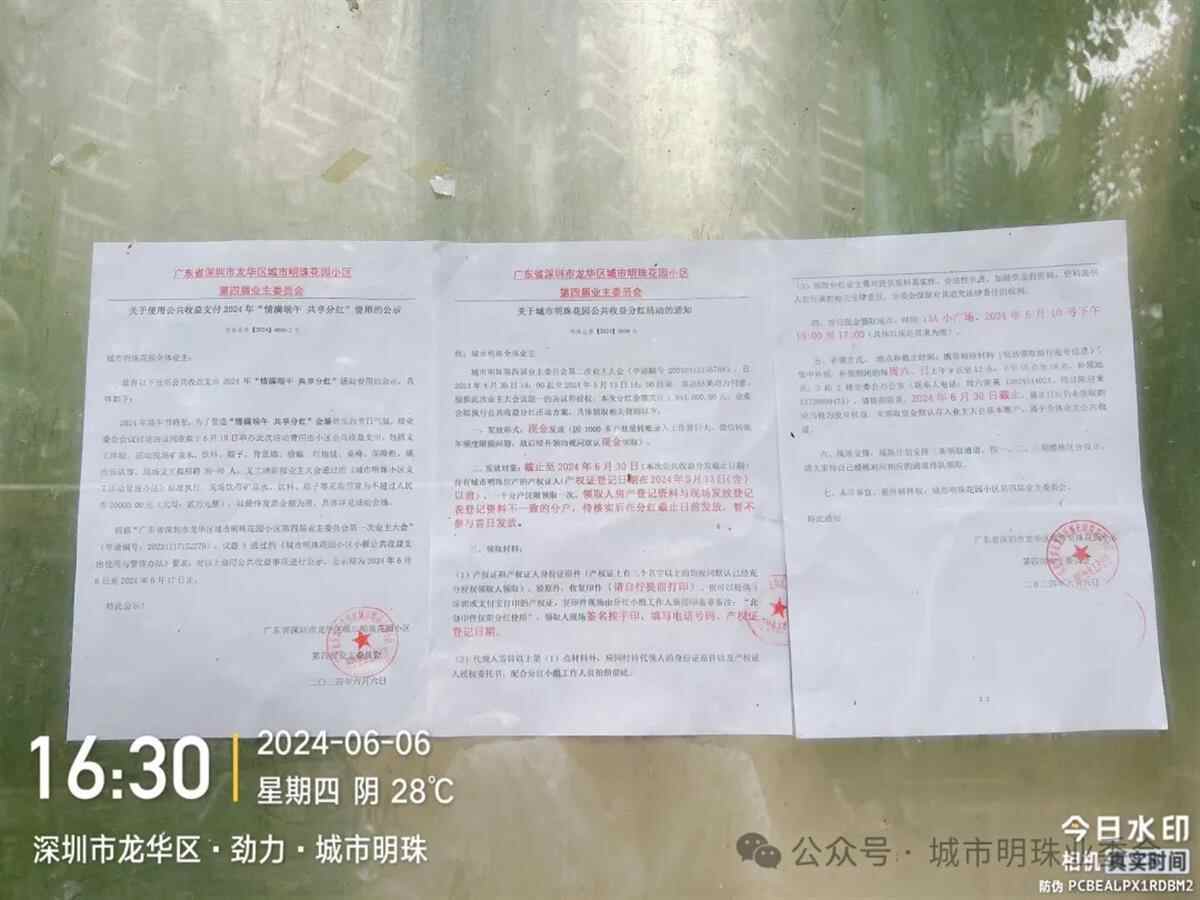 城市明珠业委会公众号消息,端午节将至,根据业主大会的决议和授权,本次分红金额共计约184万元。发放形式为现金发放,发放对象是截至2024年6月30日(本次公共收益分发截止日期)持有城市明珠房产的产权证人(产权证登记日期在2024年5月13日(含)以前),一个分户仅限领取一次。业主需携带相应材料,首日现金领取时间在6月10号下午,6月30日截止,截止日后仍未领取的应当视为放弃权益,未领取资金默认存入业主大会基本账户,属于全体业主公共收益。