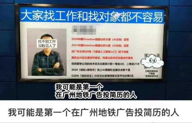 此外,也有网友称自己在地铁投放了求职广告。他表示,最近找工作期间,突发奇想在广州地铁上投放自己的简历,花了1000元在珠江新城B1出口投了5天个人广告,大概2天内他的微信就被“加爆”了。