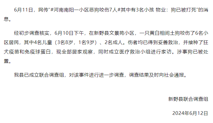 经初步调查核实,6月10日下午,在新野县文景苑小区,一只黄白相间土狗咬伤了6名小区居民,其中4名儿童(3名8岁,1名9岁)、2名成人。