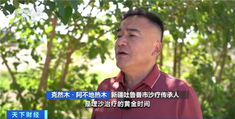 新疆吐鲁番市沙疗传承人 克然木·阿不地热木:每年6月份至9月份是埋沙治疗的黄金时间,去年我们共接待游客10万人次,今年有望进一步突破。