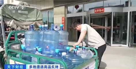 高温天气下,出行的人们打起了遮阳伞、戴上了遮阳帽。 受高温天气影响,人们对饮用水的需求也增加不少,在乌鲁木齐市的一处楼宇,送水工人比平时忙碌很多。